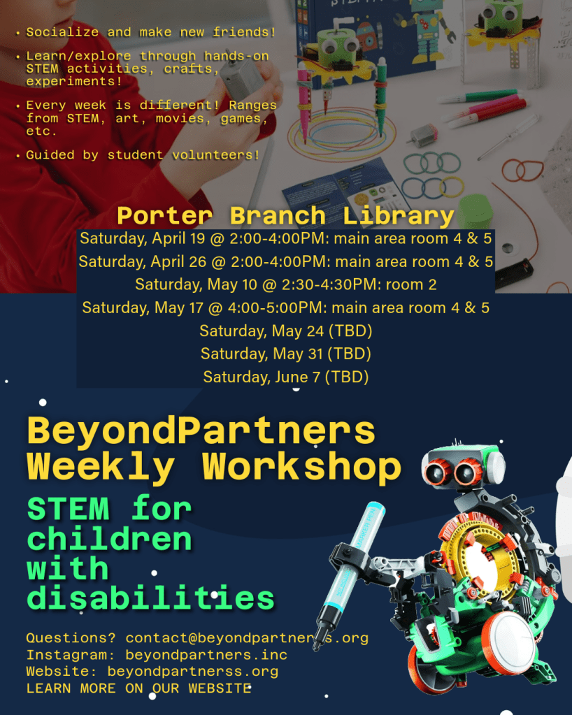 You’re invited to join us every Saturday, at Porter Branch CRRL Library (located in Stafford, VA). Come socialize and make new friends while pursuing different extracurricular activities, exploring STEM, and learning new skills! Activities will differ weekly, ranging from coding/robotics, art, science experiments, DIY crafts, movie night, game night, and more. This program is cost free, and a great opportunity for your child to explore new interests and get curious. Activities are guided by student volunteers who have experience working with kids with disabilities and all activities will be kid-friendly, safe, and compatible with all age levels.