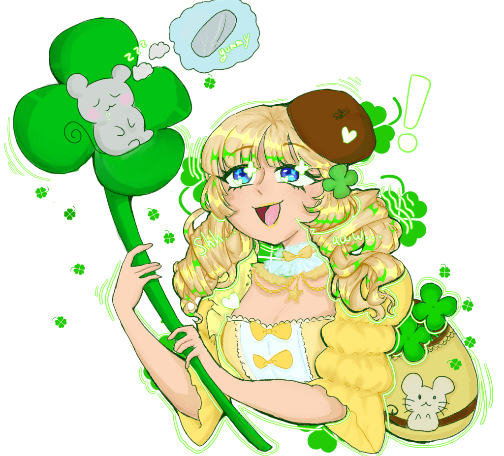 7-12th Grade First Place Winner “I think I’m lucky people I’m able to create my own characters and express myself through art and story telling. This drawing is of an original character of mine catching her pet mouse sleeping in a giant clover.”